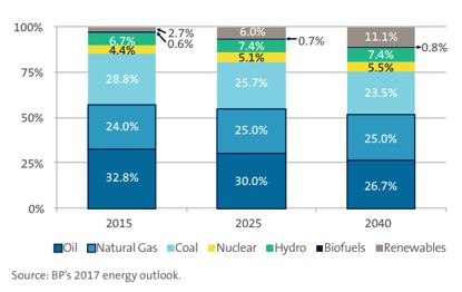 Natural gas will be the fastest growing fossil fuel with an increasing share of the overall energy mix (from 24.0% in 2015 to 25.0% in 2040), driven by a vast North American shale gas resource base. Meanwhile oil and coal will continue to lose market share falling to 26.7% and 23.5% by 2040, respectively. The declining 2000-15 trend of oil use is expected to continue and coal will be impacted by continued coal-to-gas switching. Fossil fuels’ share of overall global energy use is expected to fall to 75.2% in 2040 from 85.6% in 2015. Renewables will continue to play an increasingly important role in the power generation mix in the future, with their share of the energy mix rising to 11% in 2040.