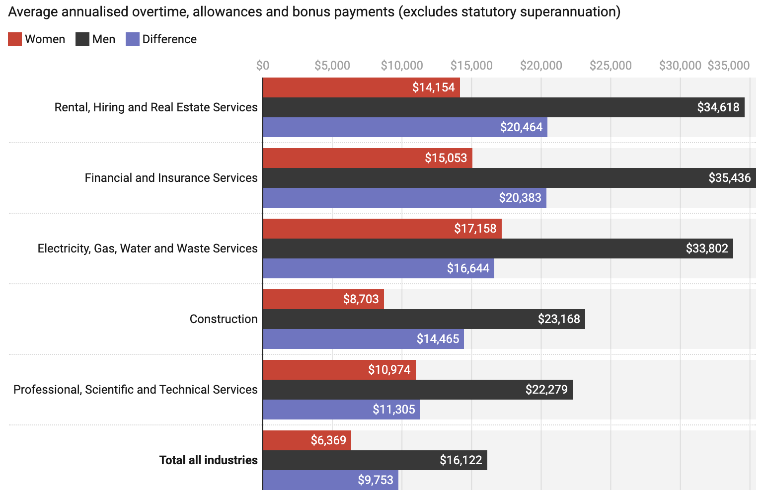 Men are earning on average A$9,753 more than women each year in the form of performance bonuses, allowances and overtime pay.